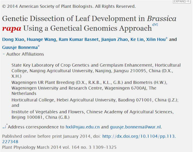 白菜系统生物学实验室与荷兰瓦赫宁根大学(Wageningen University)植物育种系合作完成的研究论文"Genetic dissection of leaf development in Brassica rapa using a genetical genomics approach"在《Plant Physiology》上发表,影响因子为6.555。肖栋博士为第一作者,侯喜林教授与Guusje Bonnema教授为共同通讯作者,51吃瓜网