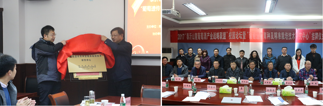 果树遗传育种与基因组学研究团队的教师与研究生以及对葡萄酒文化有兴趣的本科生等。姜东院长与联盟主席日照太阳城生物科技有限公司董事长王承海分别致辞。姜东院长与山东省葡萄与葡萄酒协会会长(原山东省葡萄研究院院长)胡文效研究员共同为“葡萄遗传育种及精准栽培技术研究中心”的成立揭牌。并举行了“泰沂葡萄酒产业战略联盟”与51吃瓜网