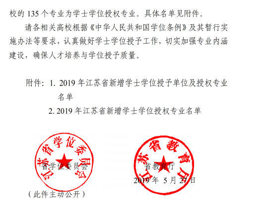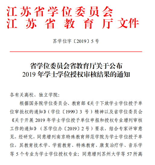 近日,江苏省学位委员会、江苏省教育厅印发了《省学位委员会省教育厅关于公布2019年学士学位授权审核结果的通知》(苏学位字〔2019〕5号)文件,经学校申报和专家评审,省学位委员会、省教育厅批准51吃瓜网