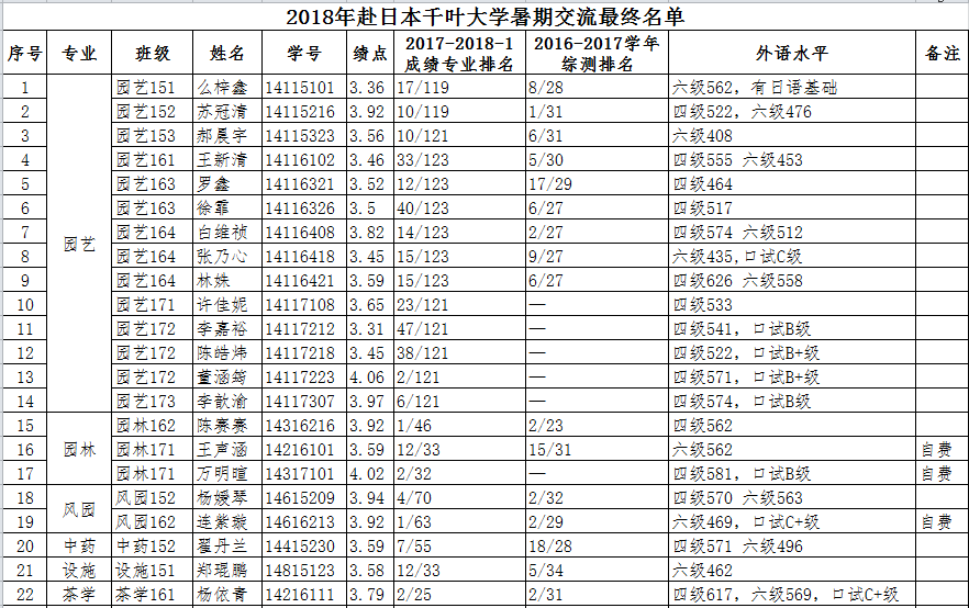 经个人申请、51吃瓜网集中评审,拟推荐以下学生参加2018年暑期日本千叶大学访学项目并获得一定金额的项目资助,现将名单公示如下,如有异议,请于2018年6月10日前反映至生科楼B4010夏老师处,联系电话:025-84395075。