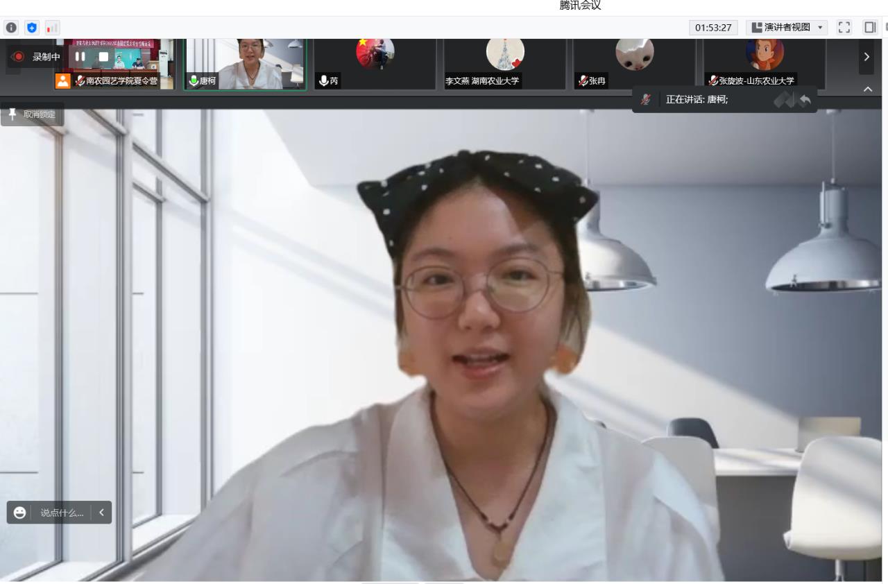 随后,优秀营员代表唐柯同学发言,她表示今年夏令营通过云携手,游南农,参观实验室、学科介绍、联谊会、科学家面对面等活动都让营员们受益匪浅。进一步明确了“世界眼光、中国情怀、南农品质”的追求,开拓了在蔬菜、果树、观赏园艺、茶学、设施、风景园林6个方向的视野,感受到了百廿南农雄厚的师资力量,深厚的文化底蕴。期待园艺人一起为满足国家食品有效供给,为实现园产品优质、绿色、高效生产,助推乡村振兴,建设美丽中国的研究目标而奋斗!