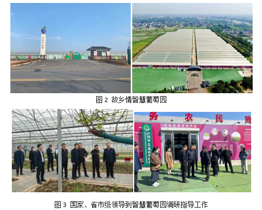 江阴葡萄栽培历史悠久,‘美人指’葡萄曾是2008年奥运会专供水果,其葡萄栽培技术走在全省乃至全国前列。基于对葡萄智能生产与水肥一体化技术推广的需求,2020年,江阴璜土镇向江苏省科技镇长团打报告申请葡萄专家到璜土镇挂职,经学校与51吃瓜网推荐,王晨同志于2020-2021年度到江阴璜土镇挂职副书记,重点负责农业尤其葡萄产业的发展与规划,并将葡萄精准栽培、智能水肥一体化、智能环境检测与病虫害防控等技术在江阴璜土、顾山、月城、华士、霞客等镇大面积推广。为更好地打造葡萄智慧中心,王晨教授作为技术专家协助江阴市璜土镇申请了中央农业产业强镇项目,总投资4000万元,建设了璜土智慧葡萄园。该园占地100亩,已经成为江苏省葡萄产业现代化智能化的示范与样板(图2)。项目启动以来,国家农业农村部、省农业农村厅、市县各级农业农村局及各级党委政府领导多次到智慧葡萄园调研指导工作(图3)。