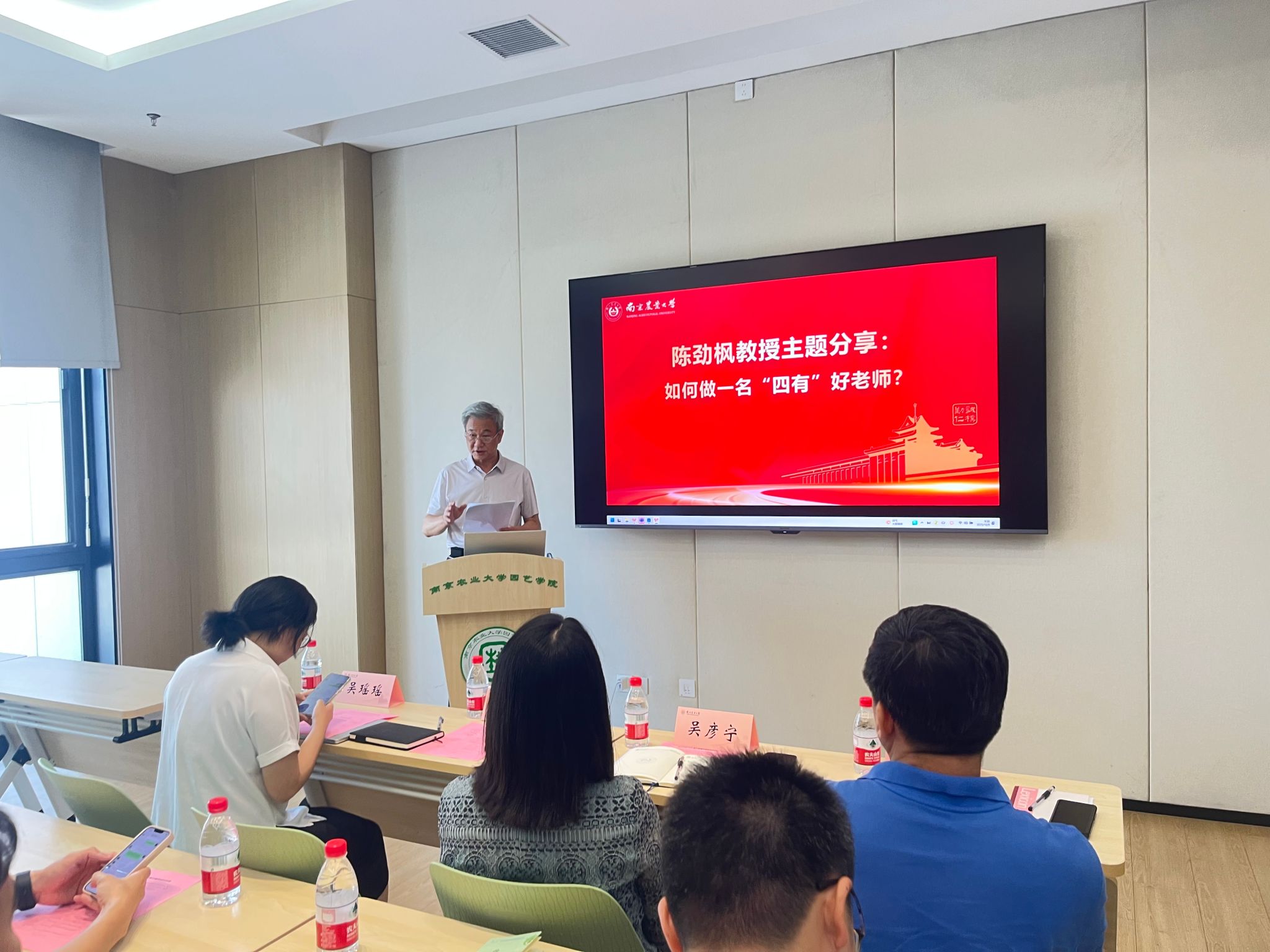 陈劲枫教授以“如何做一名‘四有’好老师?”为题,结合几十载从教心得,深刻阐释了新教师的职责与使命。他强调,面对新时代、新校园、新征程,青年教师一是要做有理想信念的导师,成为指引学生前行的灯塔;二是要做有道德情操的楷模,以身作则树立品格标杆;三是要做有扎实学识的学者,以真才实学提升育人本领;四是要做有仁爱之心的园丁,用真诚关爱滋养学生心田。随后,他更以“教练员”与“运动员”的形象比喻,强调青年教师既要自身持续学习,也要善于传授本领,在实践中将“四有”标准内化于心、外化于行,真正做到以德立身、以德立学、以德施教。
