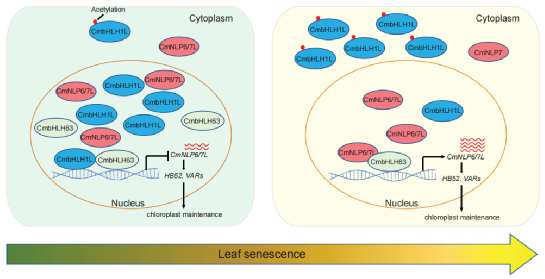 进一步研究发现,在叶片衰老过程中,CmbHLH1L蛋白在细胞核中的积累量逐渐减少,而其在细胞质中的积累量则相应增加。质谱分析和亚细胞定位实验发现,CmbHLH1L蛋白在其第140位赖氨酸(K140)处发生了乙酰化修饰,这种修饰会阻碍其在细胞核内的积累。由于CmbHLH1L在细胞核中的含量降低,其与CmNLP6/7L竞争结合CmbHLH63的程度也随之减弱,从而减轻了对CmNLP6/7L的抑制作用,最终提高了CmNLP6/7L的表达水平,并进一步调控了叶片的衰老进程。
