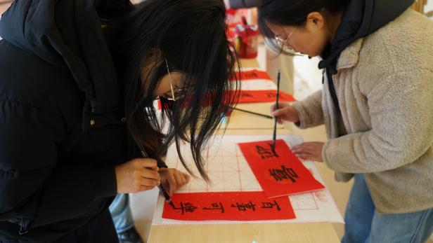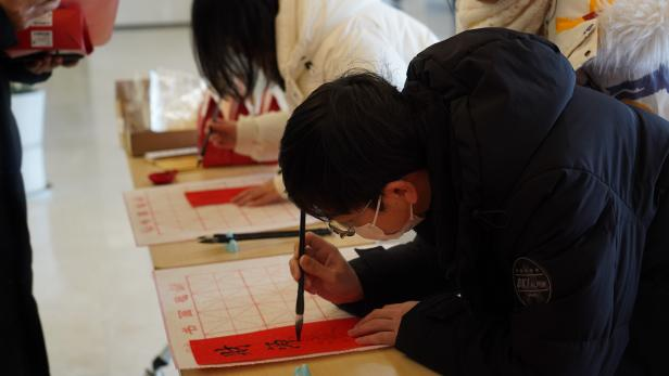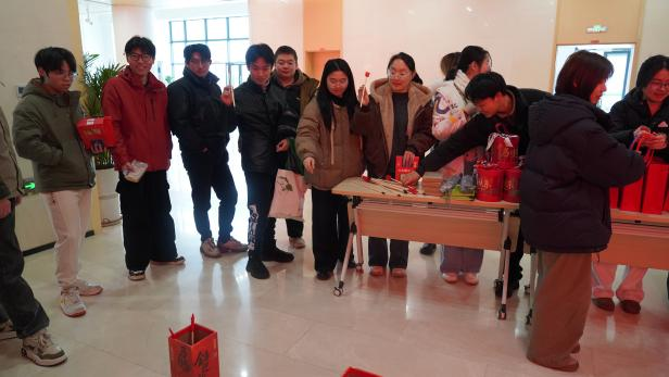 座谈会后,年味十足的新春游园会拉开帷幕,现场气氛热烈、其乐融融。在“迎春送福”对联书写区,同学们铺纸研墨、提笔挥毫,将美好的新年愿景凝于笔端。在猜灯谜区同学们驻足沉思,在智慧碰撞中体验传统游艺的乐趣。趣味投壶与套圈游戏吸引了众多学生参与,现场掌声喝彩不断。拍立得留影点前,一张张即时成像的相片定格了欢声笑语,也留存了温暖的新春记忆。游园会气氛热烈,传统年俗与青春活力交织融合,洋溢着喜迎新春的欢乐氛围。